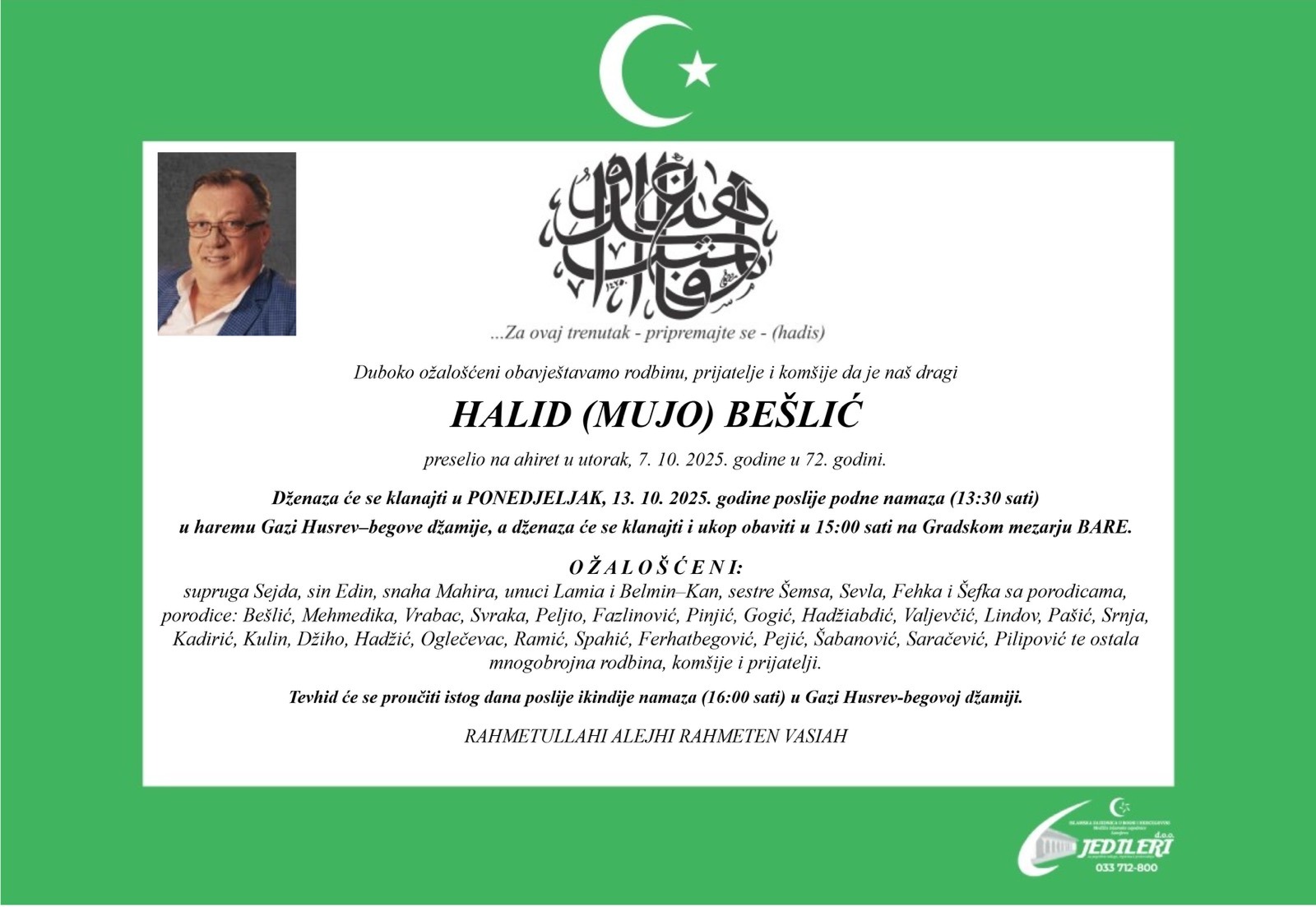 Saopšteno je da će se posljednji ispraćaj Halida Bešlića održati u ponedjeljak, 13. oktobra, a detalji o ceremoniji su već poznati. Dženaza-namaz će se klanjati u Gazi Husrev-begovoj džamiji u Sarajevu, odmah nakon podne namaza, tačnije u 13:30 sati. Ukop će se obaviti na Gradskom mezarju Bare u 15 sati. Ova ceremonija omogućit će svim njegovim obožavateljima da se oproste od njega i iskažu poštovanje prema njegovom životu i radu. Osim članova porodice, očekuje se veliki broj njegovih prijatelja, kolega iz muzičke industrije, kao i fanova koji su ga pratili kroz cijelu njegovu karijeru.
