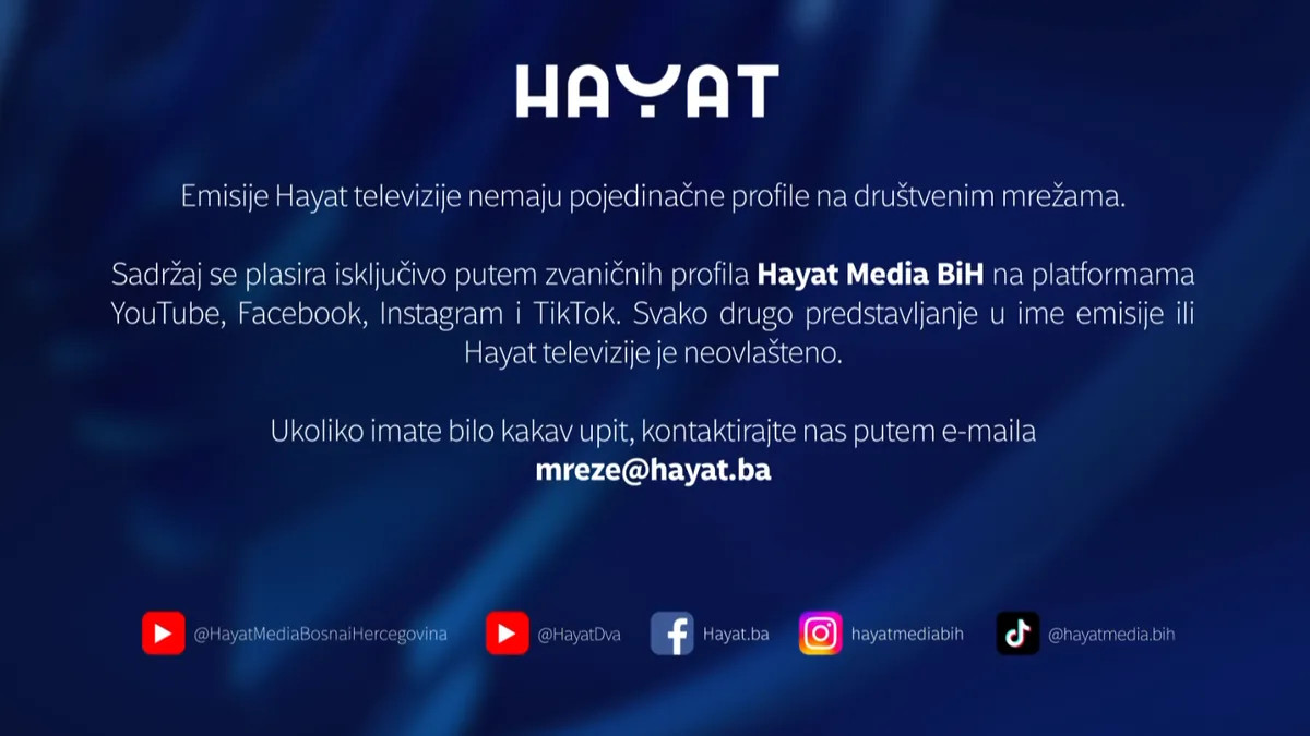 Na osnovu nedavnih upita, Hayat televizija želi naglasiti da nemaju bankovne račune u inostranstvu niti koriste neautorizovane e-mail adrese za komunikaciju. Službena e-mail adresa emisije “Ispuni mi želju” je imz@hayat.ba. Uključivanje u donacijske aktivnosti zahtijeva da sve informacije dolaze isključivo iz zvaničnih kanala, a to uključuje i njihove profile na društvenim mrežama kao što su YouTube, Facebook, Instagram i TikTok. Uvijek je preporučljivo da donatori provjere da li su informacije koje primaju iz zvaničnih izvora, čime se dodatno smanjuje rizik od prevara.